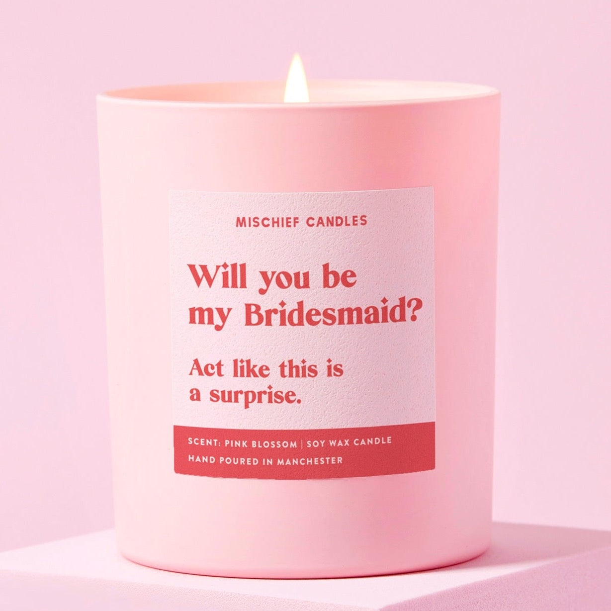 This cheeky candle design makes a lovely Bridesmaid Gift and is the perfect way to ask the all-important question. The message on the candle reads ‘Will you be my Bridesmaid? Act like this is a surprise' in our signature bold red font on a pale pink label.