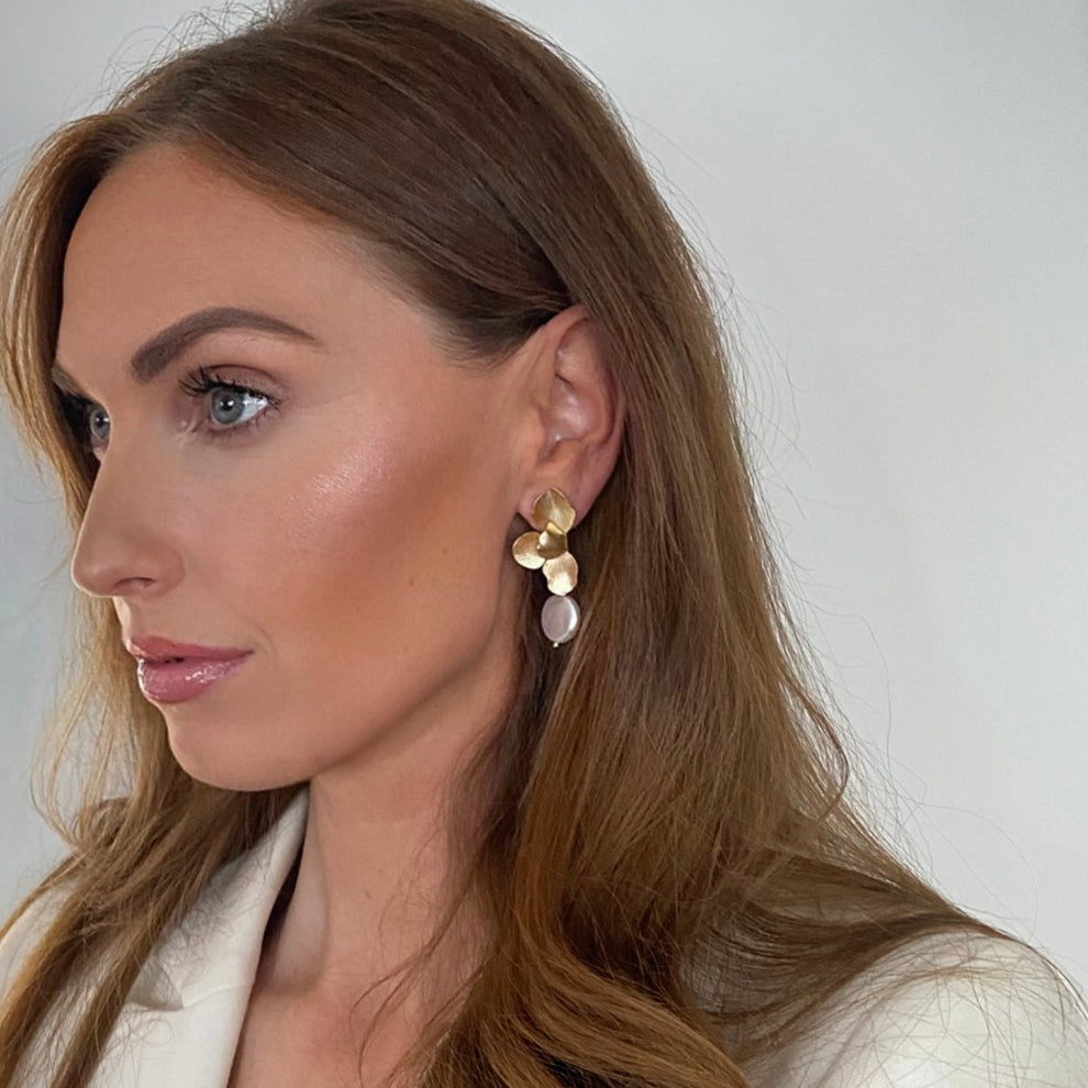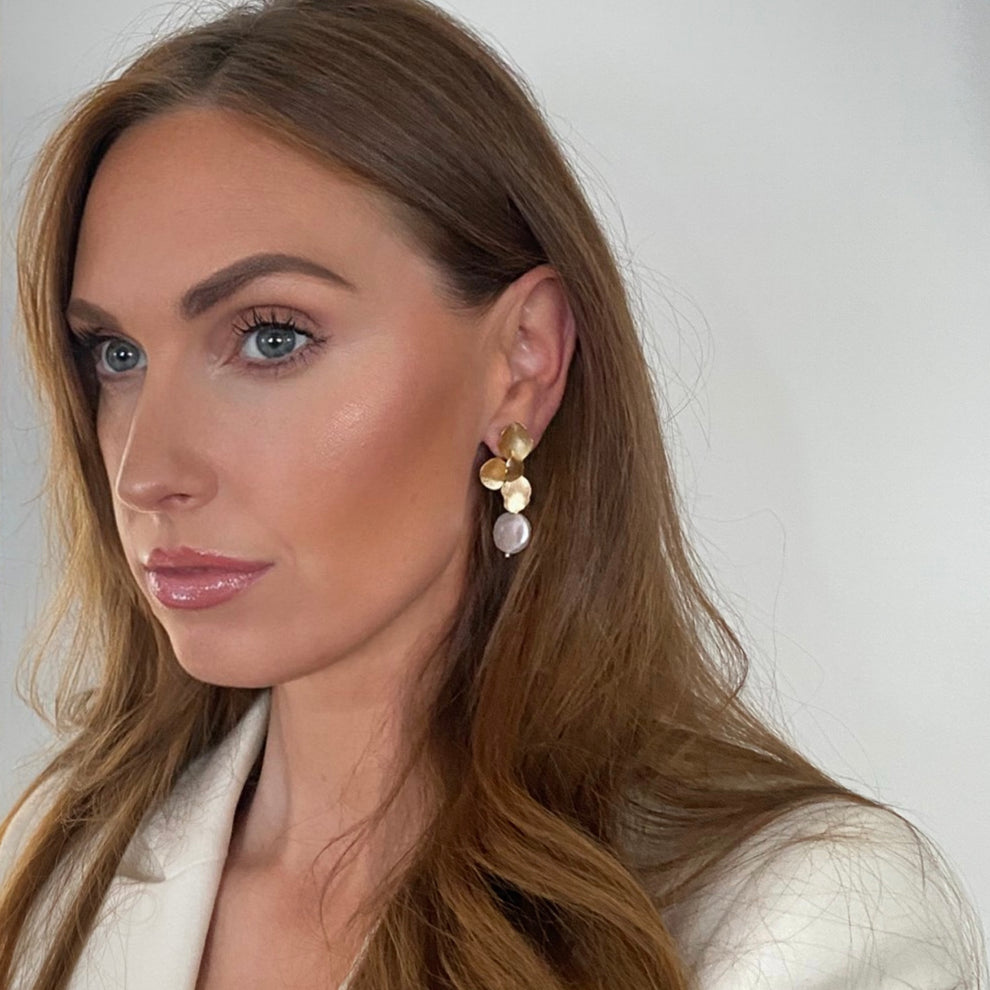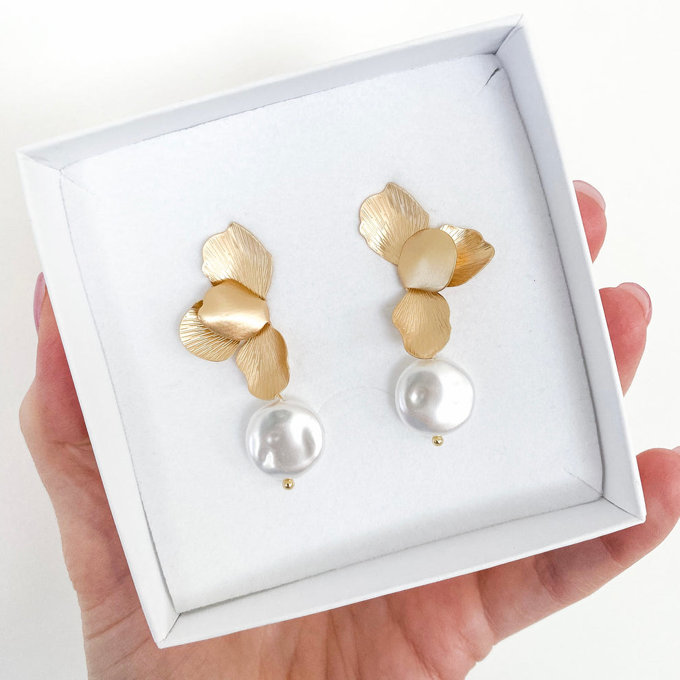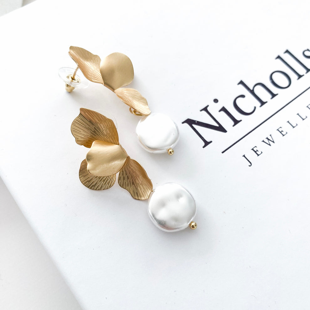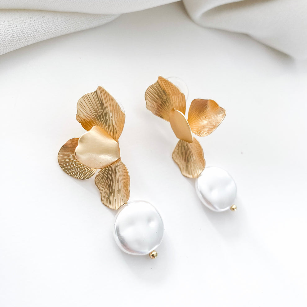 Expertly crafted from lightweight copper, these Gold Folded Flower Pearl Earrings are both unique and beautiful.