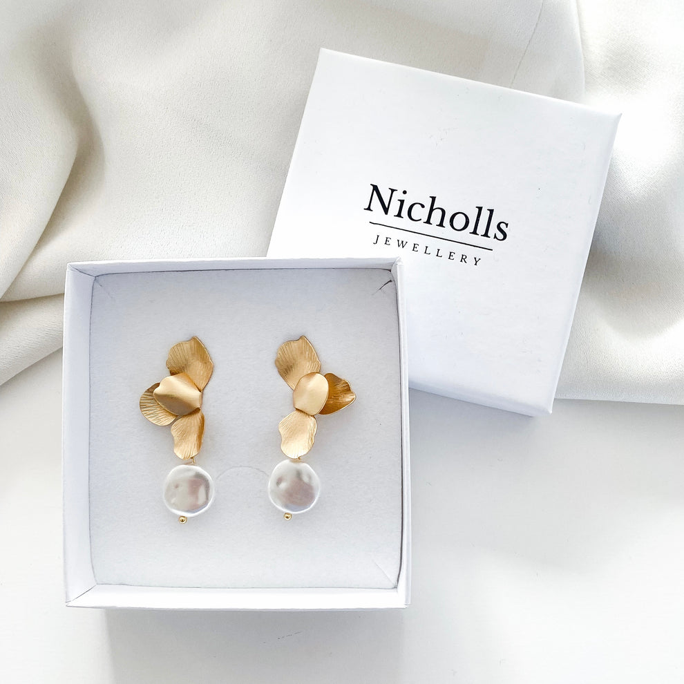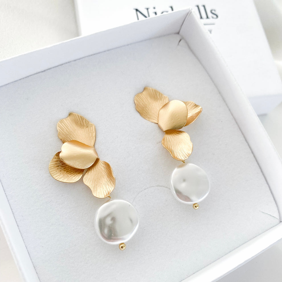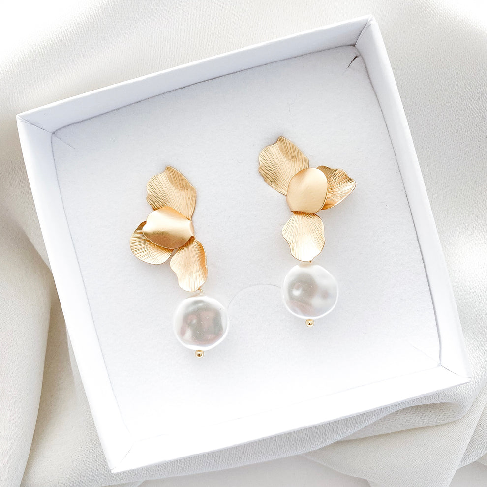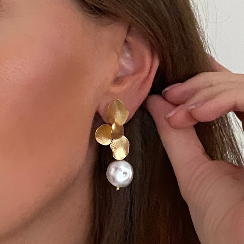 The folded flower design, accented with natural pearls, adds a delicate touch to any outfit. Perfect for all-day wear, these earrings are a must-have addition to any jewellery collection.